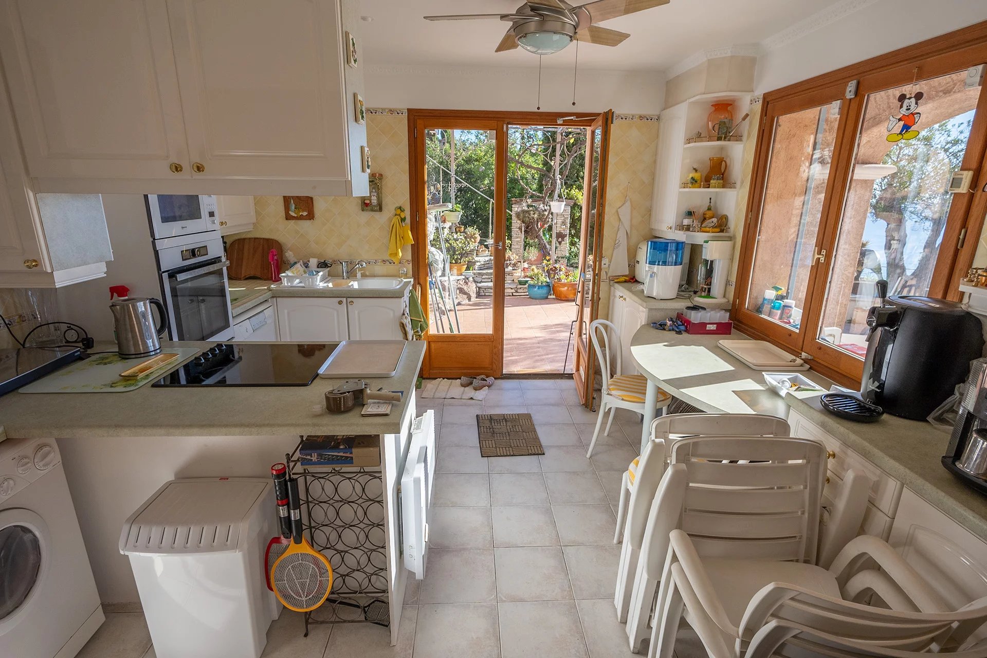 D’environ 150 m², la propriété s’étend sur deux niveaux. Le rez-de-jardin abrite un vaste salon lumineux ouvert sur la terrasse et la piscine, parfait pour se détendre ou recevoir tout en admirant la vue. Une cuisine indépendante avec un coin petit-déjeuner complète cet espace convivial. À l’étage se trouvent une entrée, un bureau, deux chambres, ainsi qu’une chambre d’enfants, certaines avec accès direct à la terrasse supérieure offrant une vue mer imprenable.